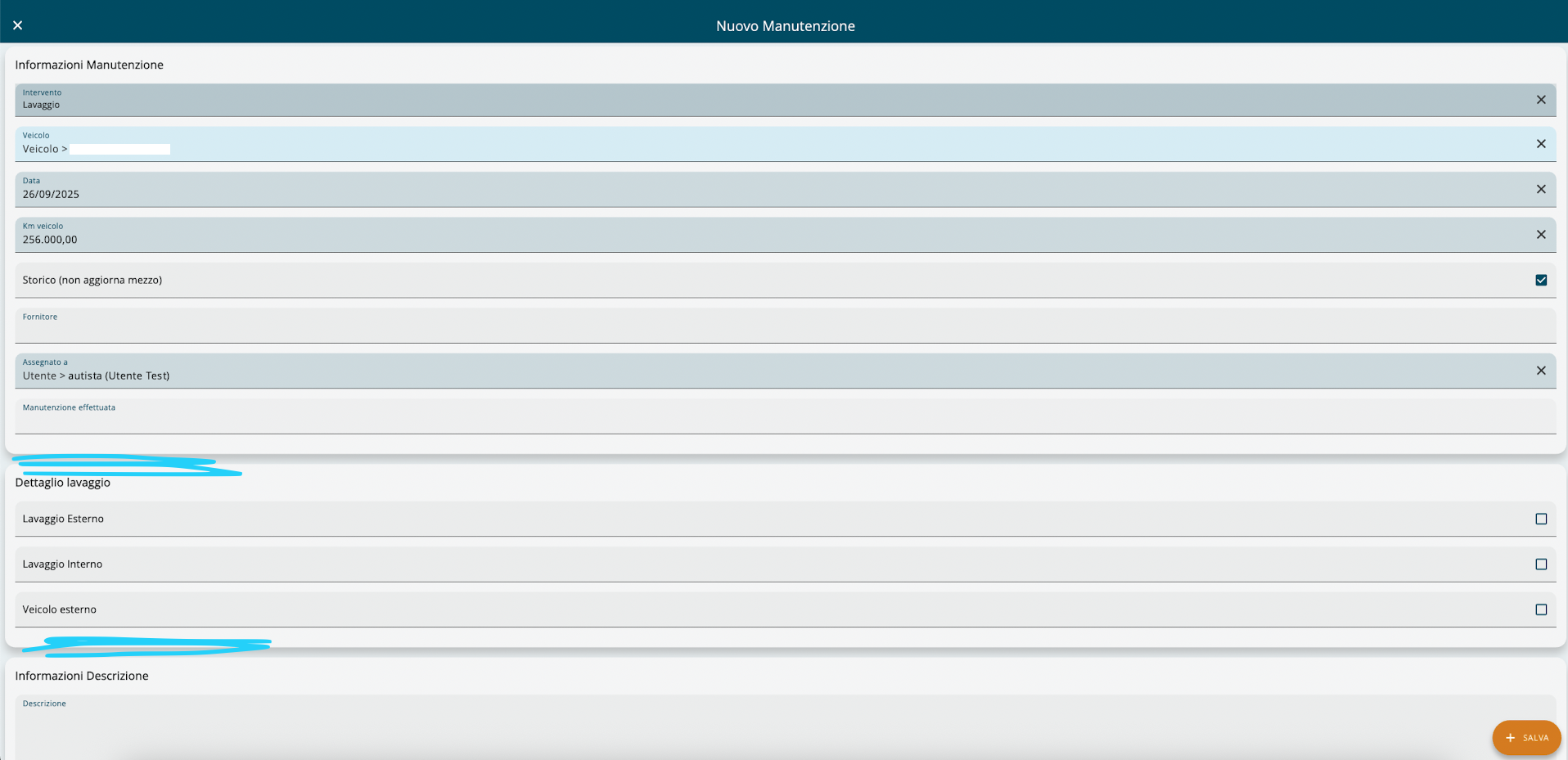 - Km veicolo: inserite manualmente i km del veicolo selezionato, avendo cura di separare le cifre decimali con la "," invece che con il "." per evitare errori nei calcoli automatici.