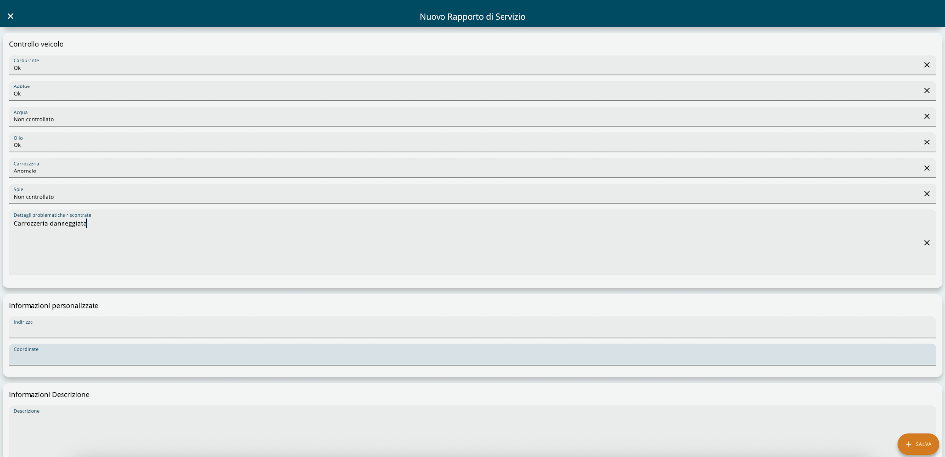 Per ognuna di queste, potete scegliere tra 3 opzioni: Non Controllato, Ok, Anomalo; questo in base al tipo di controllo che avete effettuato, se è avvenuto. Nella sezione Dettagli problematiche riscontrate, potrete scrivere manualmente qualsiasi tipo di anomalia o problematica sopraggiunta in modo dettagliato.