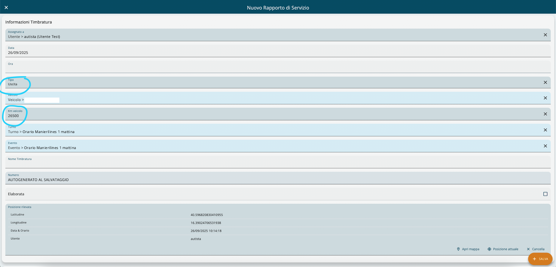 Inoltre, dopo aver inserito il Veicolo, se utilizzato, dovrete aggiornare i Km del Veicolo, con il nuovo conteggio dei Km che riporta il Veicolo.