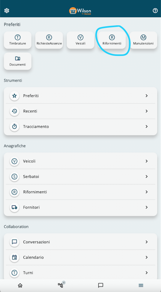 Avvio della procedura: cliccare sui trattini in basso a destra (Menu) e successivamente sul rettangolo "Rifornimenti":