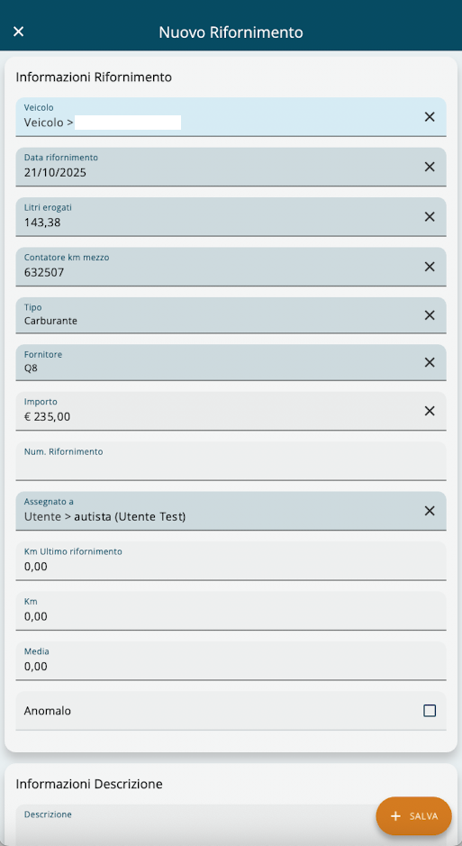 - Veicolo, scegliendolo dalla lista, che compare dopo aver cliccato nella casella;