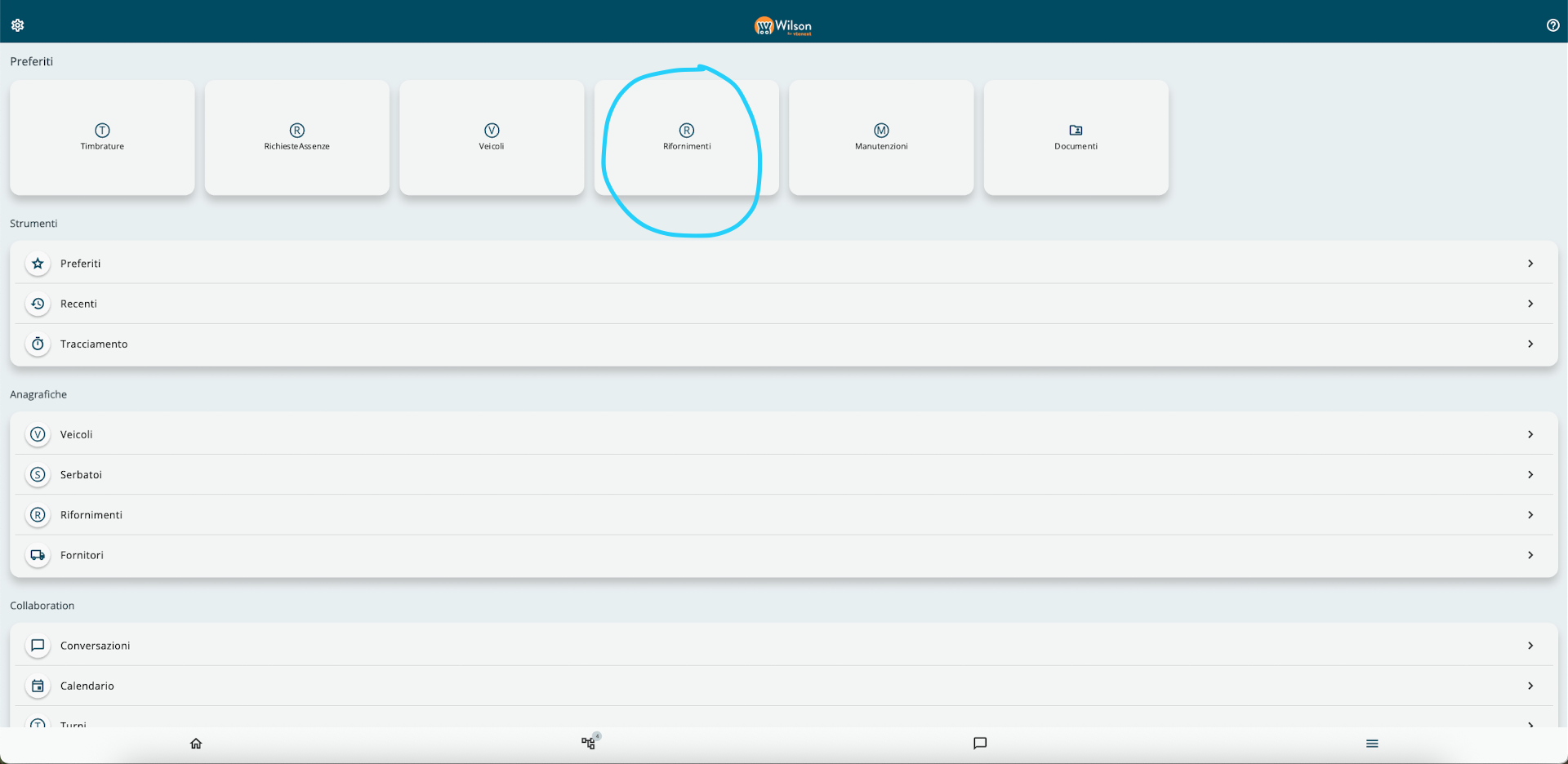Avvio della procedura: cliccare sui trattini in basso a destra (Menu) e successivamente sul rettangolo "Rifornimenti":